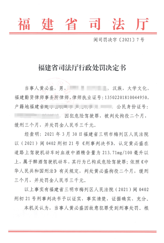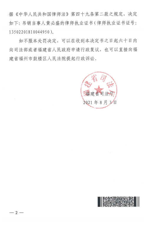 福建勤贤律师事务所黄必盛律师因故意犯罪受到刑事处罚被吊销律师执业证书